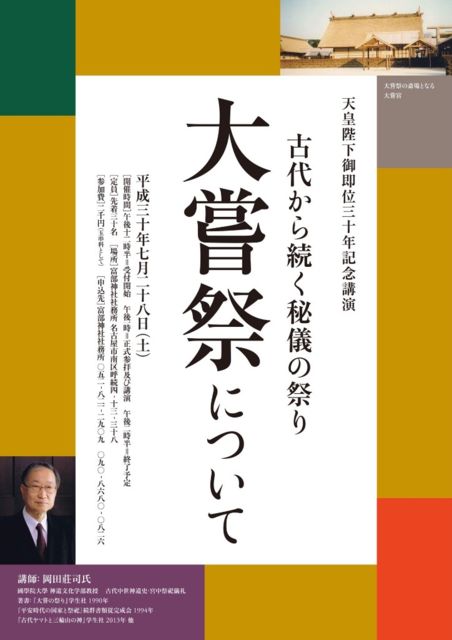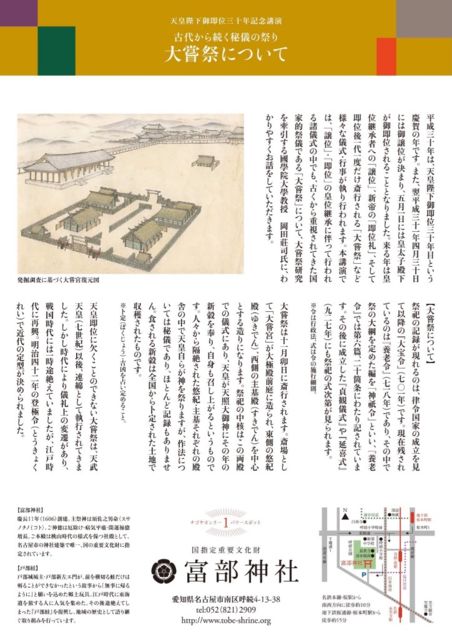 7月28日(土)午後1時から【古代から続く秘儀の祭り 大嘗祭について】という講演会があります。 大嘗祭(だいじょうさい)とは、天皇即位の後、最初に執り行なわれる11月の新嘗祭(にいなめさい)のことで、来年11月は大嘗祭が行われます。 この大嘗祭について、國學院大学教授の岡田荘司氏がお話しくださいます。 宮司さんが美人で有名な神社でもあります(笑) 予約制ですので、参加ご希望の方は直接、富部神社さんにお電話して下さいね。 ご質問も富部神社さんにお願い致します。 富部神社 052-821-2909