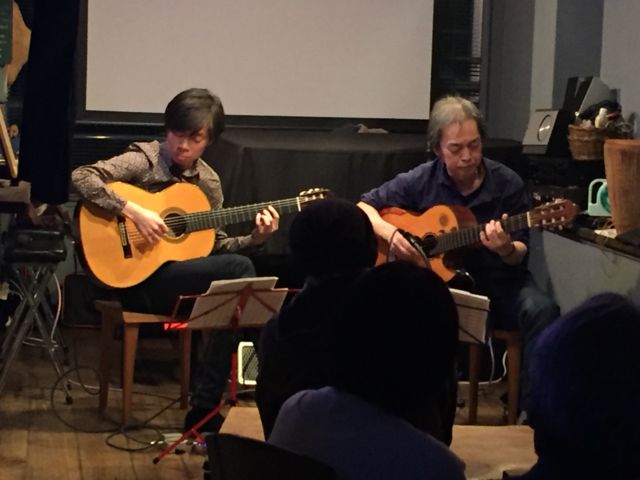 宮野弘紀さんと堀江洋賀さんのギターデュオです。 宮野さんは、ジョン・マクラフリンとジャンゴ・ラインハルトの影響を受けてギタリストを志したということです。 この、世代も音楽性も異なる二人のギタリストに影響を受けているとあって、宮野さんは、幅広い音楽活動を展開しています。 ジャズ、ショーロ、タンゴ、J-popなど演奏活動、テレビ番組などの音楽の作曲やプロデュース、枚挙にいとまがありません。 堀江さんはおなじみです。昨年「ギブソンジャズギターコンテスト2017」で、最優秀賞受賞の快挙です!!!審査員の小沼よう