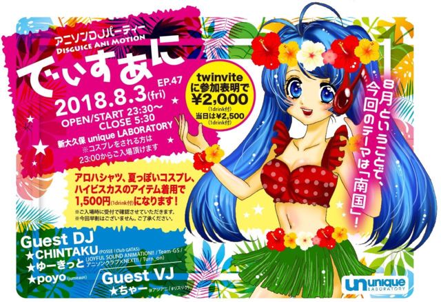AnimeSong DJ Party Disguise(²¾Áõ¢Î¥³¥¹¥×¥ì)¡Ü Anime(¥¢¥Ë¥á)¡ÜMotion(ư¤)¡á¡ÖAniMotion¡× ά¤·¤Æ ¡Ö¤Ç¤£¤¹¤¢¤Ë¡× ¤Ç¤£¤¹¤¢¤Ë ¤Ï¡¢¡Ö³Ú¤·¤¯¼«Í³¤Ë¡×¤ò¥³¥ó¥»¥×¥È¤Ë ²û¤«¤·¤Î¥¢¥Ë¥½¥ó¤«¤éºÇ¿·¤Î¥¢¥Ë¥½¥ó¤Þ¤Ç³Ú¤·¤á¤ë ¸¶¶ÊÃæ¿´¤ÎÀµÅýÇÉ¥¢¥Ë¥½¥óDJ¥Ñ¡¼¥Æ¥£¡¼¤Ç¤¹¢ö »×¤¤¤¤êÍÙ¤ë¤âÎɤ·¡ª ¤ª¼ò¤ò°û¤ß¤Ê¤¬¤é¤Þ¤Ã¤¿¤ê³Ú¤·¤à¤Î¤âÎɤ·¡ª ¥¢¥Ë¥á¤¬Âç¹¥¤¤Ê¿Í㤬¥¢¥Ë¥á¥½¥ó¥°¤òÄ̤¸¤Æ·Ò¤¬¤ì¤ë¡¢³Ú¤·¤á¤ë¡£ ¤½¤ó¤Ê¥Ï¥Ã¥Ô¡¼¤Ê¥Ñ¡¼¥Æ¥£¡¼¤òÌܻؤ·¤Æ¤¤¤Þ¤¹¡ª º£Ç¯¤Î8·î²ó¤Î¥Æ¡¼¥Þ¤Ï¡Ä Æî¹ñ