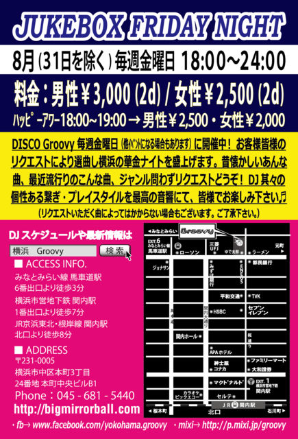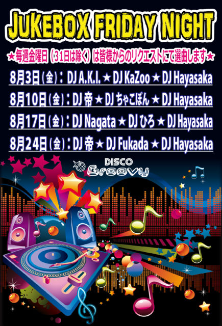 ★お客様からのリクエストにて選曲するイベント:JUKEBOX FRIDAY NIGHT★ 昔懐かしいあんな曲、最近流行りのこんな曲、ジャンル問わずリクエストをどうぞ! DJそれぞれのプレイスタイルを皆様でどうぞお楽しみ下さい♬ 【音楽】オールジャンル(リクエスト優先) Soul、Funk、Dance Classics、HipHop、R&B、EDM、Euro、etc... 【開催時間】 18:00〜24:00 【ハッピーアワー料金 / 18:00〜19:00にご来店の方】 男性:¥2,500 / 2Drinks 女性:¥2,000 / 2Drinks 【料金 / 19:00以降ご来店の方】 男性:¥3,000 / 2Drinks 女