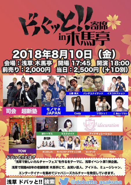 「浅草ドバッ!!と寄席 in木馬亭」 日時:08/10(金) 開場17:45 / 開演18:00 会場:浅草木場亭 料金:前売2,000円 / 当日2,500円 (1D別500円) ※外国籍の方 無料 チケット:7/26 21:00〜 https://tiget.net/events/33353 出演: 〈MC〉超新塾 〈お笑い芸人〉イヌコネクション/Cody/ものまねJAPAN 〈アイドル〉はっぴっぴ/アイドキュレーション 〈ミュージシャン〉TOW 〈パフォーマー〉マスクメイド/紗トーマス 終演後物販:20:30〜21:30