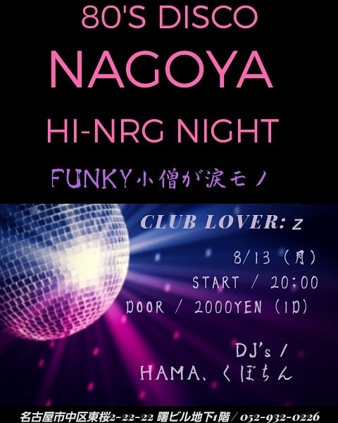 80's DISCO ̾¸Å²°¥Ï¥¤¥¨¥Ê¥¸¡¼NIGHT 8/13 (·î) START 19;00 DOOR 2000yen ¡Ê1D¡Ë DJ's / HAMA ¡¢¤¯¤Ü¤Á¤ó ¤ªËߤ˳«ºÅ¡ª Djs¡¡ HAMA¡¢¤¯¤Ü¤Á¤ó ¤´ÅöÃÏ¡ªÌ¾¸Å²°¥Õ¥¡¥ó¥¡¼¾®ÁΤ¬ÎÞ¥â¥Î¥Ï¥¤¥¨¥Ê¥¸¡¼¡¢À±¤Î»Ò¥Ï¥¤¥¨¥Ê¥¸¡¼¶¯¤á¡¢ ¥Þ¥Ë¥¢¥Ã¥¯¥Ï¥¤¥¨¥Ê¥¸¡¼¡¢ ¥í¥Ã¥¯¡¢¥Ý¥Ã¥×¥¹¤Ê¤É¤â¸ò¤¨¤¿80s ¥ª¡¼¥ë¥ß¥Ã¥¯¥¹¤Ç³«ºÅ¤¤¤¿¤·¤Þ¤¹¡£ ¾ì½ê¡§ CLUB LOVER:£ú ½»½ê¡§ ̾¸Å²°»ÔÃæ¶èÅìºù2-22-22 ½ì¥Ó¥ëÃϲ¼1³¬ ÅÅÏá§ 052-932-0226 ¡¡¡¡¡¡*Åì²£INN̾¸Å²°±É¤È¤Ê¤ê ÃÏ¿Þ https://goo.gl/maps/8TXgt3uTxAL2 ¡úͽ¹ð¡ú¡ú¡ú¡ú