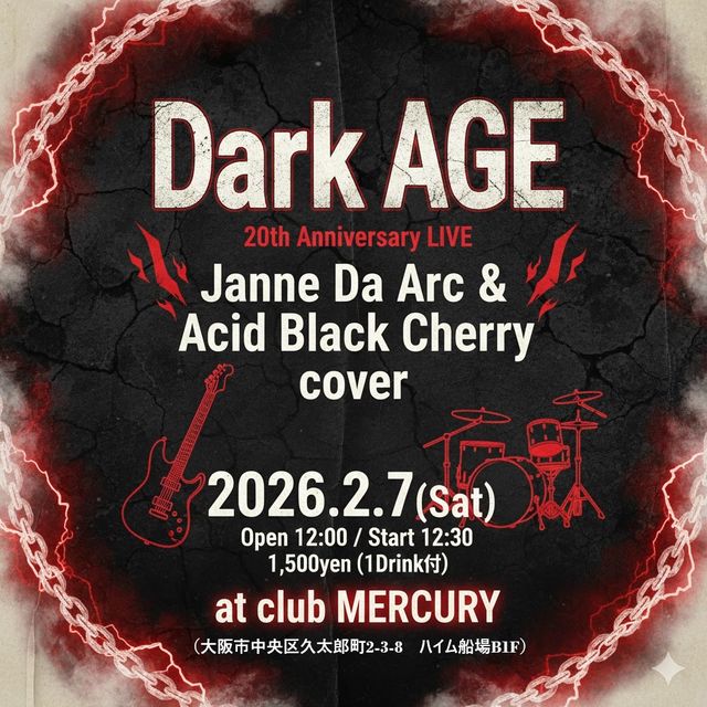 貴重なスペースお借りいたします。 大阪で活動しているバンド「Dark AGE」と申します。 今度Janne Da ArcとAcid Black Cherryのコピーで、ライブをさせていただきます。 Janne&ABC好きなみなさんと楽しい時間を過ごせたらと思います。お時間ある方、ぜひお越しください! 「Dark AGE 20th Anniversary LIVE」 日時:2026年2月7日(土) 開場:12:00 開演:12:30 料金:1,500円(1Drink代込)  場所:club MERCURY(大阪市中央区久太郎町2-3-8 ハイム船場B1F) (当イベントはワンマンライブです。Janne Da Arc&Acid Black Cherryのコピ