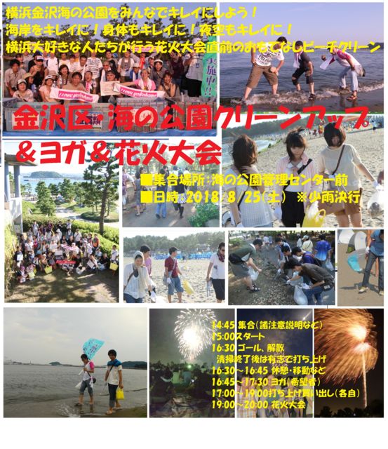 ハマラブグループ公式イベント 海の公園ビーチクリーンアップを今年も開催! 「金沢まつり花火大会」当日、花火客が集まる前のビーチでゴミを拾います。 その後はみんなで花火鑑賞♪毎年恒例、夏の人気イベントです。 清掃終了後にヨガインストラクターの指導の下、青空ヨガも開催(任意参加)。 程よく身体を刺激した後でいよいよ花火! キレイな花火を見る前に、ビーチをキレイにしませんか? ―――――I LOVE YOKOHAMA【横浜】 主催――――――― ――――――― YOKOHAMA Refresh! G103 ――――――― ――― 海の公園 ビーチクリ
