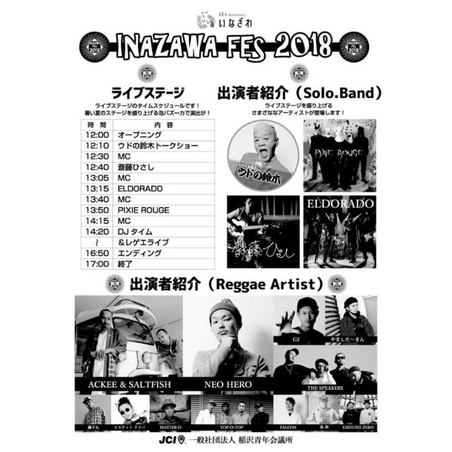 ¢¡INAZAWA FES 2018¢¡ ¡Ú½Ð±é¡Û ¥¦¥É¤ÎÎëÌÚ ÀÆÆ£¤Ò¤µ¤· ELDORADO ACKEE & SALTFISH NEO HERO G2 ¤ä¤Þ¤·¤¿¡Á¤Þ¤ó THE SPEAKERS PIXIE ROUGE START12:00/END17:00 TICKET:Æþ¾ì̵ÎÁ PIXIE ROUGE¤Ï13:50¡Á¤Î½Ð±éͽÄê¤Ç¤¹ ¥µ¥ê¥ª¥Ñ¡¼¥¯ÁÄÉã¹¾¡§°¦Ãθ©°ðÂô»ÔÁÄÉ㹾ĮÁÄÉã¹¾ÆéÅç132