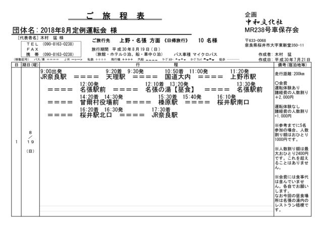 ★2018年8月5日 実施日を8月25日(土)に変更しました。 ★2018年8月24日 集合場所を桜井駅北口に変更しました。 上野名張方面を予定。添付資料参照ください。 集合場所・出発時間> ★桜井駅北口 8:50発 ※JR奈良からの参加者なしのため、出発場所を桜井駅に変更しました。 ※途中の経路上での乗降もご相談に応じます。ただし会費は同額です。 <会費> 運転体験あり:2,000円+諸経費の人数割り 運転体験なし;1,000円+諸経費の人数割り ※諸経費の人数割りについてはおひとりの上限2,400円とさせていただきます。それ 以
