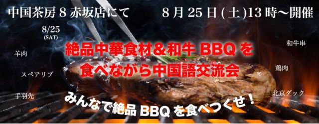 ◇◆◇◆◇◆◇◆◇◆◇◆◇◆◇◆ *中文下面 ☆第39回 日中交流会パンダクラブ@絶品中華食材&和牛BBQを食べながら中国語交流会☆ 〜参加費3000円!(ワンドリンク&デザート付) 大家好〜♪日中交流会パンダクラブです(^^♪ 「圧倒的な量」x「本場の中華テイストの料理」x「抜群のコスパ」 それが中国茶房8クオリティということは既に周知の事実! では、そんな「中国茶房8」でBBQパーティをしたら、どんな”スゴイ事態”になるのか!? ということで、今回も中国茶房8グループのマネージャさんに「羊肉串も、鶏肉串