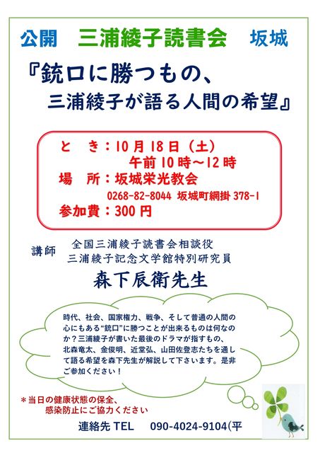 長野県の坂城で公開の三浦綾子読書会が開催されますのでご案内します。 公開 三浦綾子読書会 坂城 『銃口に勝つもの、三浦綾子が語る人間の希望』 と き:10月18日(土)午前10時〜12時 場 所:坂城栄光教会   0268-82-8044 坂城町網掛378-1 参加費:300円  講師 森下辰衛先生    全国三浦綾子読書会相談役    三浦綾子記念文学館特別研究員 時代、社会、国家権力、戦争、そして普通の人間の心にもある“銃口”に勝つことが出来るものは何なのか? 三浦綾子が書いた最後のドラマが