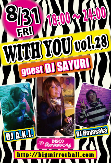 【第5の週末はあなたと一緒にGroovy!】 DJ A.K.I.プロデュースによる第5週末限定イベント☆ 今回は DJ SAYURI がゲストで登場しGOOD MUSIC満載な一夜を皆様へお贈りします♬ 【WITH YOU恒例オリジナルMIX CDプレゼント】 先着30名様へDJ A.K.I.制作によるMIX CDをプレゼント♪ 是非お早目にお越しくださいませ。 【音楽】オールジャンル Dance Classics、Soul、Funk、R&B、Hip-Hop、EDM、etc... 【開催時間】 18:00〜24:00 【ハッピーアワー料金 / 18:00〜19:00にご来店の方】 男性:¥2,500 / 2Drinks 女性:¥2,000 / 2