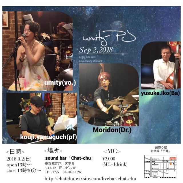 昨年9月3日に産声を上げたUmity PJ(ユミティ・プロジェクト) J-POPSの楽曲をベースにJAZZ Menが素敵にアレンジ! Vo.Yumiさんの癒しVoiceを引き立てます^^ ランチタイムでのライブですのでお食事も兼ね遊びに来てくださいませ〜♪ 2018年9月3日(日) 13:00 OPEN / 13:30 START Mチャージ 2000円(500円メニューチケット付) ◆umity\PJ umity _ vo. Koji Yamaguchi _ pf. 伊香 裕介 _ bs. 森丼 推昔 _ ds. 皆様のご予約・ご来店を心よりお待ちしています^^