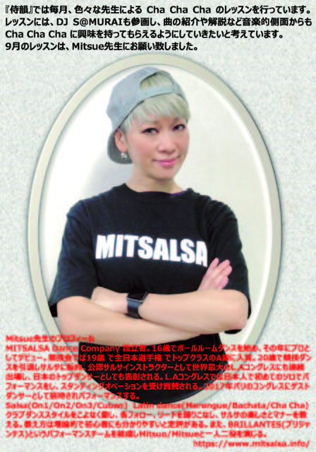 Studio Pepe2で乱舞する DJ S@MURAIオーガナイズイベント『侍韻』、 2018年9月は8日(土) 開催です。 好評頂いている「Cha Cha Cha」のレッスンにはDJ S@MURAIも参加し、 曲の紹介や解説など、音楽的側面から「Cha Cha Cha」に興味を持って もらえるようにと考えています。 今月のレッスンは、Mitsue先生です! 『侍韻』の『韻』にはS@MURAIが奏でる音の「響き」「色」「おもむき」 という意を込めました さらに 『韻』=「inn」や「in」と置き換えてpepe2という「処」を イメージできるかなと Studioで乱舞する 『侍韻』、毎