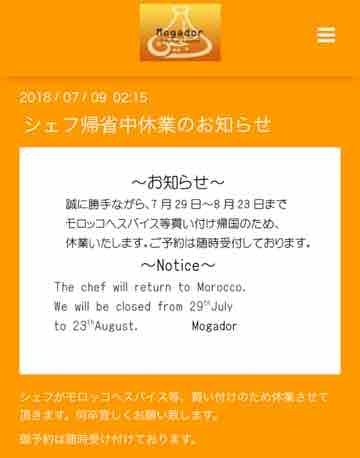 9·î¤ÎÌ뤴¤Ï¤óÀ¤³¦°ì¼þ¤Ï¥â¥í¥Ã¥³¡ª¡ª ¤Ä¤¤¤Ë¥¢¥Õ¥ê¥«¾åΦ¤Ç¤¹¡ª¡ª ¥â¥í¥Ã¥³¤Ç¤¹¡ª¡ª ¡ÚÆü»þ¡Û 2018ǯ9·î5Æü¡Ê¿å¡Ë 19:00¡Á ¡Ê7·î¤«¤é8·î23Æü¤Þ¤Ç¥·¥§¥Õ¤¬¥â¥í¥Ã¥³¤Ë¥¹¥Ñ¥¤¥¹¤ÎÇ㤤ÉÕ¤±¤ÇµÙ¶È¤·¤Æ¤¤¤Þ¤¹¡£ÌÚÍËÄêµÙ¤Ê¤Î¤ÇÂç¾æÉפÀ¤È»×¤¤¤Þ¤¹¤¬¡¢¾ì¹ç¤Ë¤è¤Ã¤Æ¤ÏÆü¤Ë¤Á¤ÎÊѹ¹Êѹ¹¤â¤¢¤ê¤¨¤Þ¤¹¡Ë 19»þ00ʬ³«»Ï¤Ë¤·¤Æ¤Þ¤¹¤¬¡¢19»þ30ʬ³«»Ï´õ˾¤ÎÊý¤¬¤¤¤Þ¤·¤¿¤éÊѹ¹²Äǽ¤Ç¤¹¡£ ¡Ú¤ªÅ¹¡Û ̾¸Å²°¥â¥í¥Ã¥³ÎÁÍý¥â¥¬¥É¡¼¥ë http://mogador.nagoya ̾¸Å²°»ÔÃæ¶èµÌ1-11-4 Ãϲ¼Å´ ¾åÁ°ÄÅ±Ø 6ÈֽиýÆî¤ØÅÌÊâ5 ¡Ú¿Í¿ô¡Û 8¿Í¤ÇͽÌó¤·¤Þ¤·¤¿¤¬¡¢10¿Í