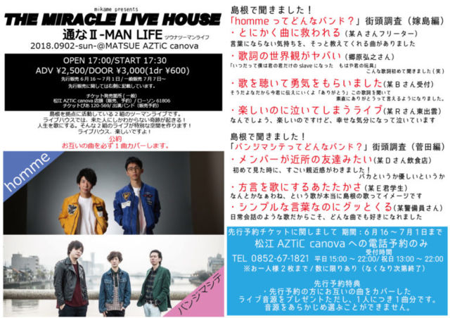 9/2(sun) 松江canova mikame presents THE MIRACLE LIVE HOUSE 通なII-MAN LIFE <CAST> homme バンジマシテ O/S 17:00/17:30 A/D 2500yen/3000yen(要drink代別) <チケット一般発売> 7/7(土)〜 <取り扱い> 松江canova ローソンチケット(Lcode:61806) チケットぴあ(Pcode:120-569) 各出演者予約 ※チケット予約は7/7以降可能。メール件名に「チケット予約」、本文に「公演日・カタカナフルネーム・枚数」を明記の上、hommehomme777@gmail.comまで。 ★チケット先行予約あり★ 先行予約期間:6月16日(土)〜7月1日(日) 予約方法