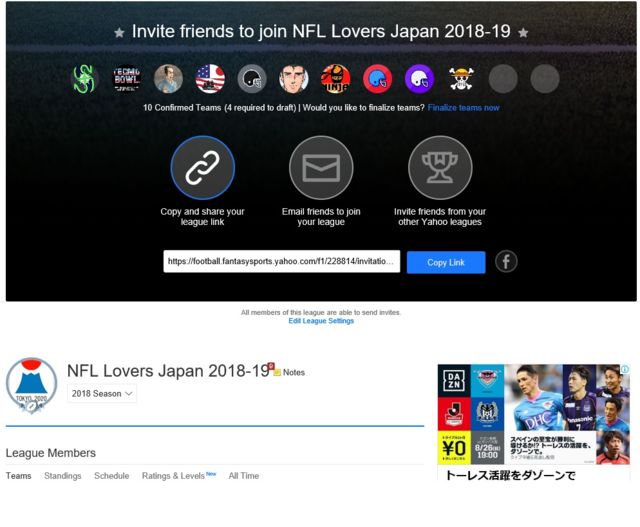 NFL好きの皆様こんにちは 毎年この時期のおなじみになってきました! US Yahooのファンタジーフットボール(NFL)のリーグ運営を長年やっています。 12チームのリーグで今年も11チーム揃いました。あと2チーム募集します。 参加はこちらからどうぞ! https://football.fantasysports.yahoo.com/f1/228814/invitation?key=040bcf0183c7b961&soc_trk=lnk&ikey=3bbc9bb4edfd0cdf 日本人、アメリカ人混ざったリーグです。あと2チームで12チームリーグが完成します。 NFL好きで、知識自慢の方、参加をお待ちしております。 NFL LOV