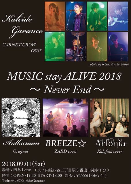 BREEZE☆ライブの詳細です♪ 前回同様、ドラムのミッチーが掛け持ちしているGARNET CROWのカバーバンドKaléido Garanceさんの企画ライブに出演します☆ ゲストバンドとしてのライブになります。 MUSIC stay ALIVE 2018 〜Never End〜 ●会場 四谷LOTUS(丸ノ内線 四谷三丁目駅 3番出口徒歩1分) ●チケット代 2000円(1drink込) ●タイムテーブル 17:30 開場 18:00 Anthurium(original) 18:40 Arfonia(Kalafina) 19:20 BREEZE☆(ZARD)←ココ! 20:00 Kaléido Garance(GARNET CROW) 21:30 終演予定 もしご都合