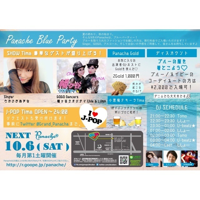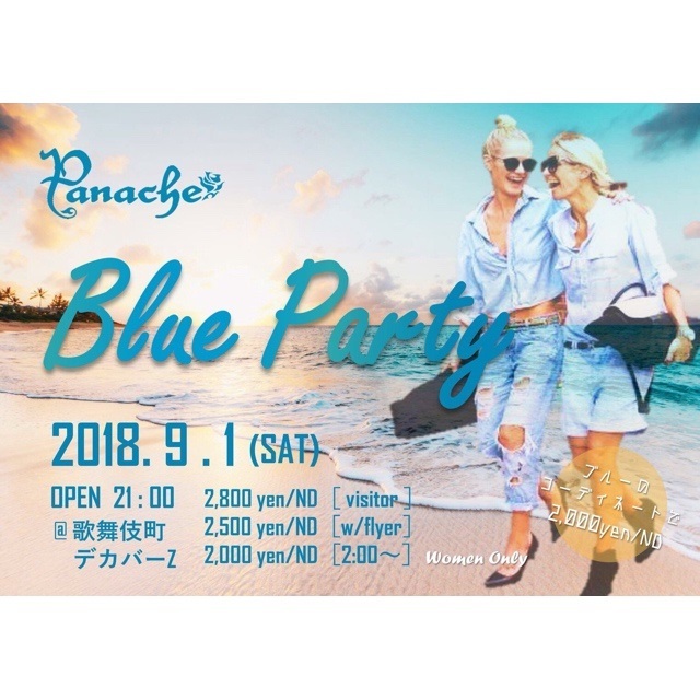 Blue Party 夏の終わり、秋の始まり。 そんな9月のPanacheは、ブルーパーティー! ブルーを取り入れたファッションでお越しの方は、割引料金でご入場いただけます!! Singer・GOGO・アルコール、そして出会いの予感をご用意して、皆さんをお待ちしています♪ ★Guest Singer Ayana GOGO 幡ヶ谷クオリティ Chie&LUNA ★話し掛けてねのサインはバラ ナンパ待ちもOK ★テキーラTime 【DJ】J-POP Timeあり♪リクエスト受付中!Twitter :@Grand_Panacheまで。 DJ Tomo/DJ ししょー/DJ U-beatz★ 【会場】デカバーZ 新宿区歌舞伎町1-2
