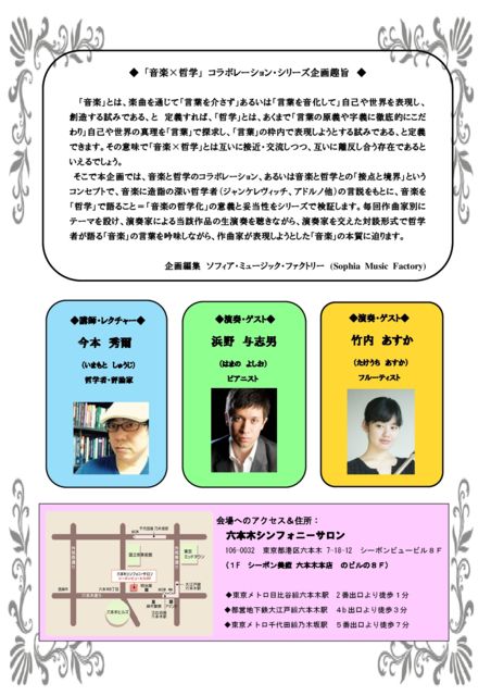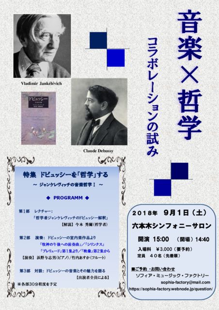 哲学と音楽とのコラボレーションというコンセプトで開催するユニークなレクチャーコンサート企画を、首都圏にて初開催いたします。今回のテーマは没後100年で話題のドビュッシーの音楽です。 3部構成にて、第1部では哲学者ジャンケレヴィッチのドビュッシー論のテクストを要約し、ドビュッシー音楽の本質について分析を行うレクチャーを実施します。第2部ではそのテクストにちなんだ音楽作品をプロの演奏家に演奏いただきます。第3部では出演者全員であらためてドビュッシー音楽の魅力について対談します。 (以上計90分を予定) 日時:2018年