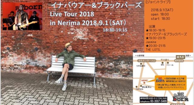 練馬music & live bar BEborn 本日、9月1日(土曜日)は、 【お気楽ライブ】 昼の部 open13:00 start 13:30 charge 1600円 (1ドリンク付) ★13:30-14:00 angie(アンジー) ★14:10-14:40 asakaband ★14:50-15:20 どいやん ★15:30-16:00 blues labo 【BEbornジョイントライブ】 open 18:00 start 18:30 charge 1,600円 (1ドリンク付) 出演 ★18:30-19:15 イナバウアー&ブラックバーズ ★19:30-20:15 Jasmine ★20:30-21:15 THE LOTS. 明日、9月2日(日曜日)は、 【光バンドセカンドライブ】 ★お気楽ライブ(ノルマ