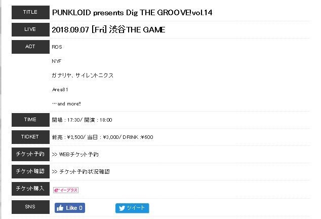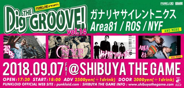 TITLE: PUNKLOID presents Dig THE GROOVE!vol.14 LIVE: 2018.09.07 [Fri] ½ÂëTHE GAME http://www.shibuyathegame.com/ ACT : ROS, NYF ,¥¬¥Ê¥ê¥ä¡¢¥µ¥¤¥ì¥ó¥È¥Ë¥¯¥¹ ,Area81 , ¡Äand more!! TIME: OPEN 17:30 , COMMENCE : 18:00 TICKET ADVANCE : \2,500 , CURRENT DAY : \3,000/ DRINK :\600 ROS WEB¥Á¥±¥Ã¥ÈͽÌó : http://www.ros.asia/form/ticket/80832/ ¥Á¥±¥Ã¥È¹ØÆþ: e+ http://eplus.jp/sys/T1U89P0101P006001P0050001P002268531P0030001P0006 ******* ¤·¤ì¤Ã¤È¡¢È¯É½¤µ¤ì¤Æ¤ª¤ê¤Þ¤¹ 9·î¤â