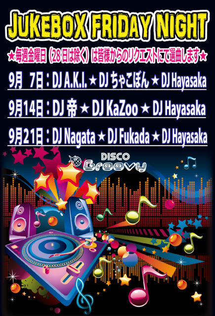 ¡ú¤ªµÒÍͤ«¤é¤Î¥ê¥¯¥¨¥¹¥È¤Ë¤ÆÁª¶Ê¤¹¤ë¥¤¥Ù¥ó¥È¡§JUKEBOX FRIDAY NIGHT¡ú Àβû¤«¤·¤¤¤¢¤ó¤Ê¶Ê¡¢ºÇ¶áή¹Ô¤ê¤Î¤³¤ó¤Ê¶Ê¡¢¥¸¥ã¥ó¥ëÌä¤ï¤º¥ê¥¯¥¨¥¹¥È¤ò¤É¤¦¤¾¡ª DJ¤½¤ì¤¾¤ì¤Î¥×¥ì¥¤¥¹¥¿¥¤¥ë¤ò³§ÍͤǤɤ¦¤¾¤ª³Ú¤·¤ß²¼¤µ¤¤♬ ¡Ú²»³Ú¡Û¥ª¡¼¥ë¥¸¥ã¥ó¥ë¡Ê¥ê¥¯¥¨¥¹¥ÈÍ¥Àè¡Ë Soul¡¢Funk¡¢Dance Classics¡¢HipHop¡¢R¡õB¡¢EDM¡¢Euro¡¢etc... ¡Ú³«ºÅ»þ´Ö¡Û 18¡§00¡Á24¡§00 ¡Ú¥Ï¥Ã¥Ô¡¼¥¢¥ï¡¼ÎÁ¶â / 18:00¡Á19:00¤Ë¤´ÍèŹ¤ÎÊý¡Û ÃËÀ¡§¡ï2,500 / 2Drinks ½÷À¡§¡ï2,000 / 2Drinks ¡ÚÎÁ¶â / 19:00°Ê¹ß¤´ÍèŹ¤ÎÊý¡Û ÃËÀ¡§¡ï3,000 / 2Drinks ½÷