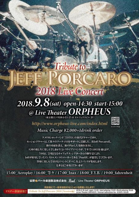 ¥Õ¥¡¡¼¥ì¥ó¥Ï¥¤¥È¼çºÅ¡¦½Ð±é¤Î¥¤¥Ù¥ó¥È¥Ú¡¼¥¸¤Ç¤¹¡£ https://www.facebook.com/events/252696975296240/ ¥¤¥Ù¥ó¥È³µÍפϲ¼µ¤Ë¤Ê¤ê¤Þ¤¹¡£ ʳ¤Ã¤Æ¤´»²²Ã¤·¤Æ¤¯¤À¤µ¤¤¤Í¡ª . Event¡¡Tribute To Jeff Porcaro 2018 ¡ÚLive ConcertÊÔ¡Û . Date¡¡2018ǯ9·î8Æü(ÅÚ) Open¡¡14:30 Start¡¡15:00 . Place¡¡Live Theater Orpheus (¥ª¥ë¥Õ¥§¥¦¥¹) http://www.orpheus-live.com/access/index.html ÅìµþÅÔ¹¾¸ÍÀîÀ¾¾®´ä1-27-16¥ª¥ë¥Õ¥§¥¦¥¹¥Ó¥ë2F TEL¡¡03-5622-3520 . ¡ú½Ð±é¥Ð¥ó¥É¡ú 15:00_ Aeroplay 16:00_ Åù¡¹ 17:00_ Inax 18:00_ F.Y.B