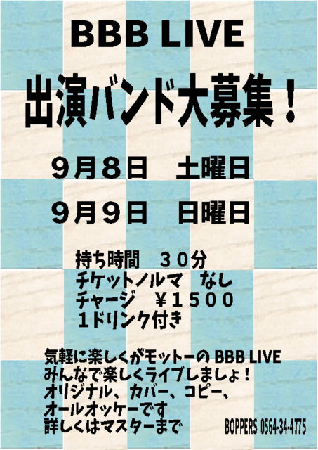 BBB LIVE ½Ð±é¥Ð¥ó¥ÉÂçÊ罸¡ª £²£°£±£¸Ç¯¡¡£¹·î£¸Æü¡¡¡¡ÅÚÍËÆü ¡¡¡¡¡¡¡¡¡¡¡¡£¹·î£¹Æü¡¡¡¡ÆüÍËÆü »ý¤Á»þ´Ö¡¡£³£°Ê¬ ¥Á¥±¥Ã¥È¥Î¥ë¥Þ¡¡¤Ê¤· ¥Á¥ã¡¼¥¸¡¡¡ï£±£µ£°£° £±¥É¥ê¥ó¥¯ÉÕ¤ µ¤·Ú¤Ë³Ú¤·¤¯¤¬¥â¥Ã¥È¡¼¤ÎBBB LIVE ¤ß¤ó¤Ê¤Ç³Ú¤·¤¯¥é¥¤¥Ö¤·¤Þ¤·¤ç¡ª ¥ª¥ê¥¸¥Ê¥ë¡¢¥«¥Ð¡¼¡¢¥³¥Ô¡¼ ¥ª¡¼¥ë¥ª¥Ã¥±¡¼¤Ç¤¹ ¾Ü¤·¤¯¤Ï¥Þ¥¹¥¿¡¼¤Þ¤Ç