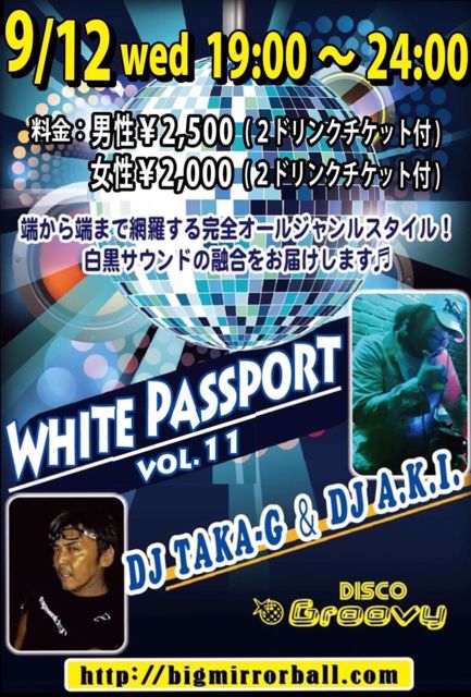 ¡ÚWHITE PASSPORT¡Û¤Þ¤Ã¤µ¤é¤Ê¥Ñ¥¹¥Ý¡¼¥È¤¬¥¹¥¿¥ó¥×¤Ç¤¤¤Ã¤Ñ¤¤¤Ë¤Ê¤Ã¤Æ¤¤¤¯¤è¤¦¤Ë¡¢³§ÍͤÎÂÀפÇËä¤á¿Ô¤¯¤·¤Æ¤¤¤¤¿¤¤¡£¤½¤ó¤Ê»×¤¤¤Ç¥¹¥¿¡¼¥È¤·¤Þ¤·¤¿¥¤¥Ù¥ó¥È¤Î vol.11 ¤Ç¤¹¡ª ü¤«¤éü¤Þ¤ÇÌÖÍ夹¤ë´°Á´¥ª¡¼¥ë¥¸¥ã¥ó¥ëSTYLE♬ Çò¹õ¥µ¥¦¥ó¥É¤ÎÍ»¹ç¤òËè·îÂ裲¿åÍËÆü¤Ë¤ªÆÏ¤±¤·¤Þ¤¹¡ù ¡ÚDJ¡Û TAKA-G / A.K.I. ¡Ú²»³Ú¡Û ¥ª¡¼¥ë¥¸¥ã¥ó¥ë / ¥ª¡¼¥ë¥ß¥Ã¥¯¥¹ ¡Ú³«ºÅ»þ´Ö¡Û 19:00¡Á24:00 ¡ÚÎÁ¶â¡Û ÃËÀ¡§¡ï2,500 / 2Drinks ½÷À¡§¡ï2,000 / 2Drinks