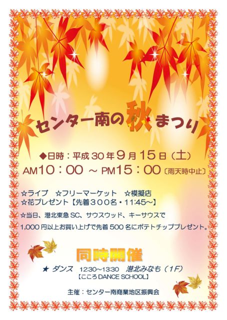 明日は、横浜市都筑区のセンター南 で開催される『 センター南の秋まつり 』そして同時開催の『タウンセンター子育て地蔵まつり 』に出演します! 『 センター南の秋まつり 』は12時頃から、『タウンセンター子育て地蔵まつり 』は14時半頃から出演します!お待ちしています! <近日 活動情報> ■9月15日(土) 横浜市都筑区 『センター南 秋まつり 』『タウンセンター子育て地蔵まつり 』 ■9月16日(日) 東京都渋谷区 『金王八幡宮例大祭』 ■9月17日(月祝) 神奈川県横須賀市 「 ソレイユの丘」 11:30〜 / 14:0