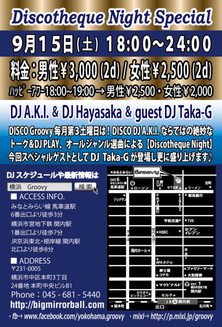 DISCO Groovy 9月も第3土曜日は! 【DJ A.K.I.】による《Discotheque Night Special》DISCO DJならではの絶妙なトーク&DJプレイにて横浜のサタデーナイトを盛り上げます! 今回はスペシャルゲストとして【DJ TAKA-G】が登場し更に熱く踊れる一夜を演出します☆ 【音楽】オールジャンル Soul、Funk、Dance Classics、Hip-Hop、R&B、EDM、Eurobeat、etc... 【開催時間】 18:00〜24:00 【ハッピーアワー料金 / 18:00〜19:00にご来店の方】 ●男性:¥2,500 / 2Drinks ●女性:¥2,000 / 2Drinks 【料金 / 19:00以降ご来店の方】 ●