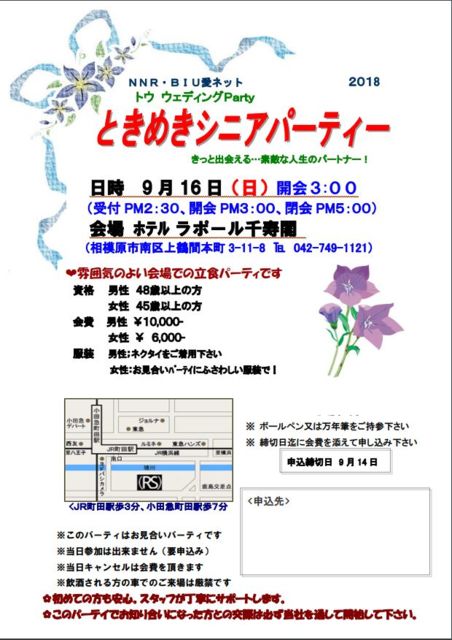 ¤È¤¤á¤¥·¥Ë¥¢¥Ñ¡¼¥Æ¥£¡¼ Æü»þ¡¡¡¡ 2018ǯ09·î16Æü(Æü) 15:00¡Á17:00¡Ê¼õÉÕ14:30¡Á¡Ë ¾ì½ê¡¡¡¡ ¥Û¥Æ¥ë¥é¥Ý¡¼¥ëÀé¼÷³Õ¡ÊJRÄ®ÅıØÅÌÊâ3ʬ¡Ë »²²ÃÈñ¡¡ ÃËÀ¡§\10000¡¡½÷À¡§\6000 »ñ³Ê¡¡¡¡ ÃËÀ¡§48ºÐ°Ê¾å¤ÎÊý¡¡½÷À¡§45ºÐ°Ê¾å¤ÎÊý Äê°÷¿ô¡¡ Ã˽÷³Æ20̾ ÆâÍÆ¡¡¡¡¤ªÂÔ¤¿¤»¤¤¤¿¤·¤Þ¤·¤¿¡£º£Ç¯¤â¤ä¤ê¤Þ¤¹¡£Ëè²óº§Ìó¼Ô¤Î½Ð¤ë¥Þ¥Ã¥Á¥ó¥°Î¨¤Î¹â¤¤20ǯ¶á¤¤Îò»Ë¤Î¤¢¤ëº§³è¥Ñ¡¼¥Æ¥£¡¼¤Ç¤¹¡£ Ãϸµ¤ÎÊýÃæ¿´¤Ç¤·¤¿¤¬¡¢º£¤Ç¤ÏÅÔÆâ¡¢ÀéÍÕ¸©¡¢ºë¶Ì¸©¤ÎÊý¤â»²²Ã¤·¤Æ¤¤¤¿¤À¤¯¤è¤¦¤Ë¤Ê¤ê¤Þ¤·¤¿¡£ ÈþÌ£¤·¤¤¿©»ö¤È³Ú¤·¤¤²ñÏᢲÈÄíŪ¤ÊÊ·°Ïµ¤¤Ç³«ºÅ¤·¤Æ¤¤¤Þ¤¹