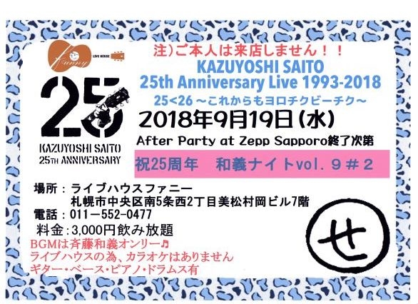 ´ÉÍý¿ÍÍÍ¡¡¥¤¥Ù¥ó¥È¹ðÃμºÎ餤¤¿¤·¤Þ¤¹¡£ º£Ç¯£µ·î¤Ë³«ºÅ¤·¤Þ¤·¤¿¡ÖÀÆÆ£ÏµÁ¥Ê¥¤¥È¡×¤Ç¤¹¤¬ 9·î¤Ë¤â25¼þǯ¥é¥¤¥Ö¤¬»¥ËڤǹԤï¤ì¤ë¤¿¤áµÞî±£²²óÌܤò ³«ºÅ¤¹¤ë¤³¤È¤Ë¤Ê¤ê¤Þ¤·¤¿¡£ ±éÁÕ¼ÔµÚ¤Ó¥ª¡¼¥Ç¥£¥¨¥ó¥¹¤Î»²²Ã¼ÔÊç½¸Ãæ¤Ç¤¹¡£ »²²Ã´õ˾¤ÎÊý¤Ï¤³¤Á¤é¤Ø¥³¥á¥ó¥È¤ª´ê¤¤¤·¤Þ¤¹¡£ ¡úÀÆÆ£ÏµÁ¥Ê¥¤¥Èvol.9¡ô£²¡ú Æü»þ¡§£¹·î£±£¹Æü¡Ê¿å¡Ë KAZUYOSHI SAITO 25th Anniversary Live 1993-2018¡¡25¡ã26 ¡Á¤³¤ì¤«¤é¤â¥è¥í¥Á¥¯¥Ó¡¼¥Á¥¯¡Á¡×½ªÎ»¼¡Âè ÎÁ¶â¡§3,000±ß¡Ê°û¤ßÊüÂê¡Ë