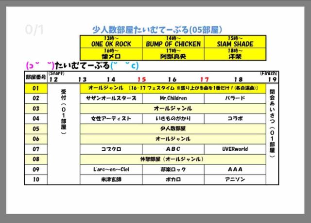 初めましての方もそうでない方もこんにちは! Mカラ幹事のMiNAと申します(о´∀`о) だいぶ過ごしやすい季節になってきましたね! 夏はあっという間に終わっていきそうですがまだはしゃぎ足りてないんじゃないんですか!? 歌い足りてないんじゃないですかー!? Mカラに来て、同じ趣味を持った仲間たちと平成最後の夏を一緒に楽しみましょー!((( *´꒳`* ))) 今回は8部屋は確定しているので、 そのうち1部屋は「幹事の気まぐれ部屋」と題して、 今まで惜しくも少人数希望部屋にも採用されそうでされなかった歌手orジャンル部屋や