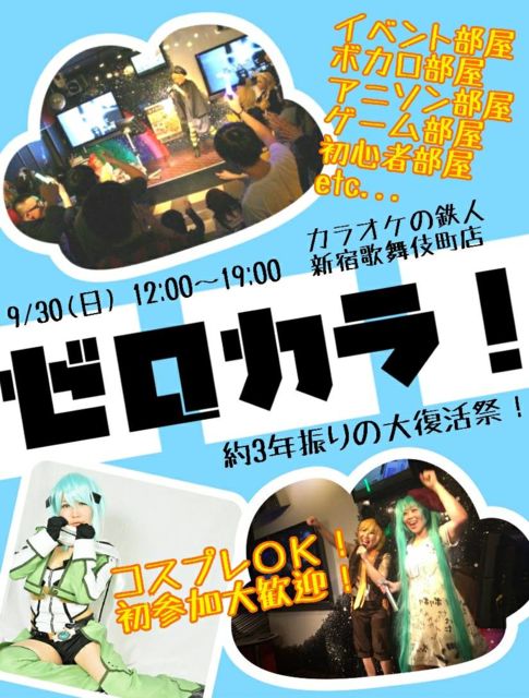 お疲れさまです!そしてお久しぶりです ゼロカラを約3年ぶりに開きます。 今回は大復活祭&大同窓会みたいな流れで行います ★同窓会という名目ですがゼロカラ参加したことないよって方やオフ会初参加の方も大歓迎!ご参加お待ちしてます!(まだ先なので予定わからないって方はとりあえずの表明でも大丈夫です) ★コスプレ参加の方は参加費100円引きあります。 コスプレするって方もコスプレせずに歌いたいって方もぜひ気軽にご参加ください 初参加やお友だちを連れてのご参加も大歓迎です。 また以前のようにみんなでワイワイと楽しく遊