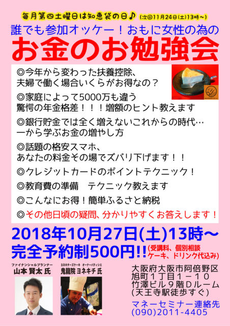 毎月第四土曜日は知恵袋の日♪ 2018年10月27日(土)13時〜 【完全予約制! 大好評につき第4弾! 人気ファイナンシャルプランナーが こっそり教えるお金の知恵袋♪ 誰でも参加オッケー! 『おもに女性の為のお金のお勉強会』】 https://www.facebook.com/events/1068585933300785/ https://ameblo.jp/wakuwaku-art-festa/entry-12409023683.html ☆☆☆☆☆☆☆☆☆☆☆☆☆☆☆ ≪参加フォームへ必ず記入ください!≫ ※ケーキやドリンクの用意が有りますので 参加ボタンだけでは参加登録となりません。 参加フォームへ必ず記入く