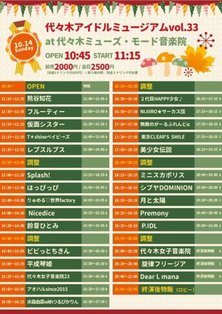 ¡ÖÂ塹ÌÚ¥¢¥¤¥É¥ë¥ß¥å¡¼¥¸¥¢¥àvol.33¡× Æü»þ¡§10/14(Æü) ³«¾ì10:30 / ³«±é11:00 ²ñ¾ì¡§Â塹Ìڥߥ塼¥º¡¦¥â¡¼¥É²»³Ú±¡ ÎÁ¶â¡§Á°Çä2,000±ß / ÅöÆü2,500±ß¡Ê1DÊÌ600±ß¡Ë¢¨ºÆÆþ¾ì²Ä(Í×1D) ½Ð±é¡§¤Ï¤Ã¤Ô¤Ã¤Ô/Dear L mana/TOKYO SWEET PARTY/¥¢¥ª¥Ï¥ësince2015/¥¢¥ó¥À¡¼¥Ó¡¼¥¹¥Æ¥£¡¼/ ¤¢¤ó¤À¡¼¤Ó¡¼¤¹¤Æ¤£¡¼/TEARS-¥Æ¥£¥¢¡¼¥º-/Neat and clean/Splash!/emperice/·î¤ÈÂÀÍÛ/Nicedice/¤ê¤å¤á¤ë♡À¤³¦factory/¥Ó¥Ó¤Ã¤È¤Á¤¤ó/²¾ÌÌ¥·¥¹¥¿¡¼/Îë²»¤Ò¤È¤ß/ÅìµþCLEAR`S SMILE/Â塹ÌÚ½÷»Ò²»³Ú±¡/Â塹ÌÚ½÷»Ò²»³Ú±¡23/NIJIIRO¡ú¥µ¡¼¥«¥¹ÃÄ/·§Ã«ÃβÖ/̵Ũ¤Î¤¬¡¼