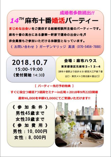 14th麻布十番婚活パーティー 日時 2018年10月07日(日) 15:00〜19:00(受付開始14:30) 場所 麻布ハウス(麻布十番駅徒歩8分) 参加費 男性:10,000円 女性:8,000円 資格 男性:45歳までの方 女性:39歳までの方 定員数 男女:各15名 内容 成婚者多数続出!まじめな出会いをご提供する結婚相談所主催のパーティーです。 麻布十番の高台にある豪華一軒家で運命の出会いを♪ 非会員様もご参加いただける体験型となっています。 【備考】<申込〆切>10/5(金)までにお申込みください。 お問い合わせは、結婚相談所仙台マリッジネ