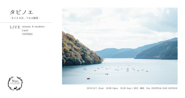 タビノエ -きこえる音、うかぶ風景- 日時2018年10月7日(日) 18:00 開場 / 18:30 開演 出演 minamo & moskitoo [.que] TINÖRKS 会場: 東京 - 蔵前 Nui. HOSTEL& BAR LOUNGE 東京都台東区蔵前2丁目14−13 料金¥2,500 + 1ドリンク 特設サイト: https://orangeplus.me/lp/tabinoe/ 予約サイト: https://nui20181007.peatix.com/ 秋の三連休にライブイベント「タビノエ - きこえる音、うかぶ風景 -」を開催します。 音楽を聴いて、自然の風景や、どこか遠くの街並みが思い浮ぶことはありませんか? 今回は「風景