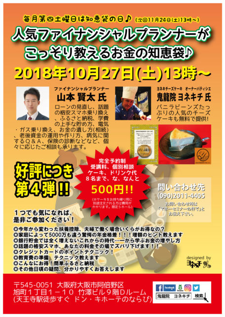 毎月第四土曜日は知恵袋の日♪ 2018年10月27日(土)13時〜 【完全予約制! 大好評につき第4弾! 人気ファイナンシャルプランナーが こっそり教えるお金の知恵袋♪ 誰でも参加オッケー! 『おもに女性の為のお金のお勉強会』】 https://www.facebook.com/events/1068585933300785/ https://ameblo.jp/wakuwaku-art-festa/entry-12409023683.html ☆☆☆☆☆☆☆☆☆☆☆☆☆☆☆ ≪参加フォームへ必ず記入ください!≫ ※ケーキやドリンクの用意が有りますので 参加ボタンだけでは参加登録となりません。 参加フォームへ必ず記入く