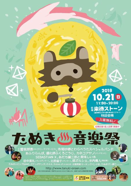 たぬき音楽祭2018 2018.10月21日(日) 会場 : 松江来待ストーン野外特設ステージ 時間 : 11:00〜20:00 入場無料 「たぬき音楽祭」は島根県在住の音楽イベント主催者らが発起人となって開催される、入場無料の野外フェスです。 ライブ、オリジナルの盆踊り、地元の小学生による太鼓の演奏など、イベントタイトル通り町のみんなで化かし化かされてしまうようなお祭りです。 出演アーティスト 寺尾紗穂とわらべうたスペシャルバンド(伊賀航/チェ・ジェチョル/歌島昌智) 曽我部恵一 あふりらんぽ カネコアヤノ(バンドセット) あだち麗