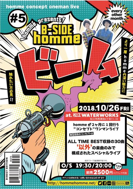 10/26(金) 松江WATERWORKS コンセプトワンマン「ビーム」vol.5 <CAST> homme O/S 19:30/20:00 前売 2500円(D代別途必要) ※本編90分程度 ※アンコールなし ※定員数あり <10/26公演の内容> オールタイムベスト収録の30曲‘以外’の曲のみで構成するライブ ※14曲程度の予定 チケット予約は、メール件名に「チケット予約」、本文に「公演日・カタカナフルネーム・枚数」を明記の上、hommehomme777@gmail.comまで。 本日8/25から予約・発売開始です! お見逃しなく