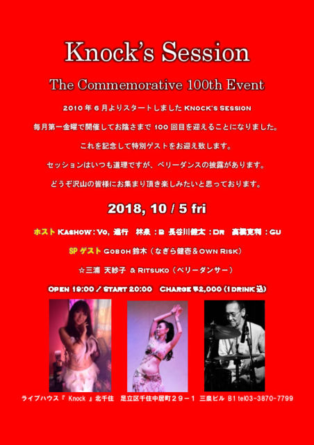 2010ǯ6·î¤è¤ê¥¹¥¿¡¼¥È¤·¤Þ¤·¤¿Knock¡Æs Session Ëè·îÂè°ì¶âÍˤdz«ºÅ¤·¤Æ¤ª±¢¤µ¤Þ¤Ç100²óÌܤò·Þ¤¨¤ë¤³¤È¤Ë¤Ê¤ê¤Þ¤·¤¿¡£ ¤³¤ì¤òµÇ°¤·¤ÆÆÃÊÌ¥²¥¹¥È¤ò¤ª·Þ¤¨Ãפ·¤Þ¤¹¡£ ¥»¥Ã¥·¥ç¥ó¤Ï¤¤¤Ä¤âÆ»Íý¤Ç¤¹¤¬¡¢¥Ù¥ê¡¼¥À¥ó¥¹¤ÎÈäϪ¤¬¤¢¤ê¤Þ¤¹¡£ ¤É¤¦¤¾Âô»³¤Î³§Íͤˤª½¸¤Þ¤êĺ¤³Ú¤·¤ß¤¿¤¤¤È»×¤Ã¤Æ¤ª¤ê¤Þ¤¹¡£ ¥Û¥¹¥ÈKashow : Vo, ¿Ê¹Ô¡¡ÎÓÀô : B ĹëÀî·òÂÀ : Dr¡¡¹â¶¶¹îÍø : Gu SP¥²¥¹¥ÈGobohÎëÌڡʤʤ®¤é·ò°í¡õOwn Risk¡Ë ¡ù»°±º Å·¼Ó»Ò & Ritsuko¡Ê¥Ù¥ê¡¼¥À¥ó¥µ¡¼¡Ë Open 19:00 / Start 20:00 Charge \2,000 (1drink¹þ)
