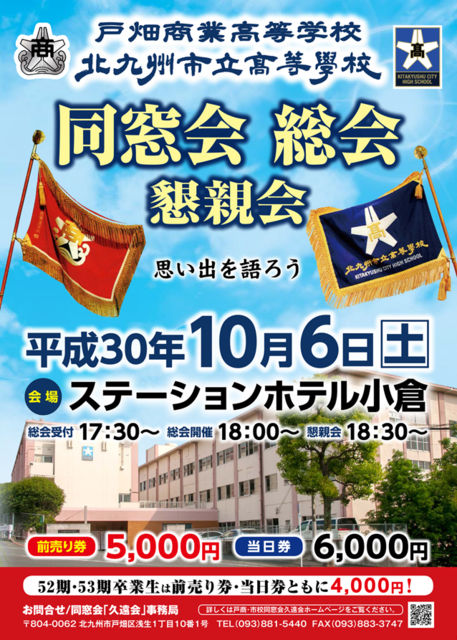 【平成30年同窓会総会・懇親会】 開催日時: 平成30年10月6日(土)18時00分〜 開催場所: ステーションホテル小倉 チケット申し込み: URL:https://kuonkai.net/ticket 【公式ホームページ】 URL:https://kuonkai.net/ 久遠会は北九州市立高等学校(旧 北九州市立戸畑商業高等学校)の同窓会です。 母校の発展のために活動しています。 当サイトでは、H29の総会の様子や母校の様子をご覧になれます。