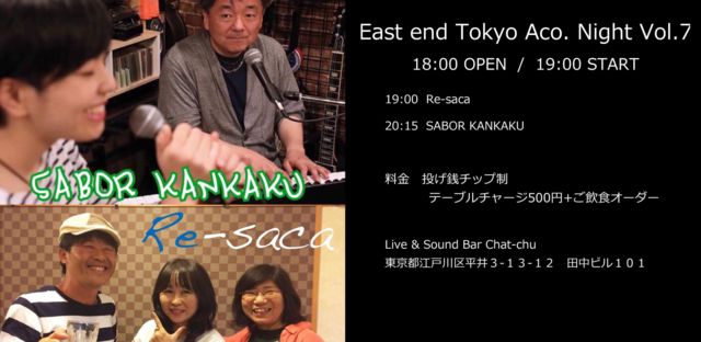 ½©¤ÎÌëĹ¤Ë¥¢¥³¡¼¥¹¥Æ¥£¥Ã¥¯LIVE¢ö ¥¹¥Æ¥¤Ê¥¢¥³¥æ¥Ë¥Ã¥È¤Î¶¦±é¤Ç¤¹^^ À§Èó¤È¤â¤ª±Û¤·¤¯¤À¤µ¤¤¡ª ¢¡East end Tokyo Aco. Night Vol.7 2018ǯ10·î6Æü(ÅÚ) 18:00¡¡OPEN¡¡/¡¡19:00¡¡START ÎÁ¶â¡¡ÅꤲÁ¬¥Á¥Ã¥×À© ¢¨¥Æ¡¼¥Ö¥ë¥Á¥ã¡¼¥¸500±ß+¤´°û¿©¥ª¡¼¥À¡¼¤ò¤ª´ê¤¤¤¤¤¿¤·¤Þ¤¹ 19:00¡Á¡¡Re-saca 20:15¡Á¡¡SABOR KANKAKU ³§ÍͤΤ´ÍèŹ¤ò¿´¤è¤ê¤ªÂÔ¤Á¤·¤Æ¤¤¤Þ¤¹^^