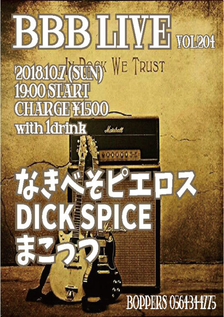 BBB LIVE 204 2018.10.7 (SUN) 19:00 START CHARGE \1500 with 1drink なきべそピエロス DICK SPICE まこっつ