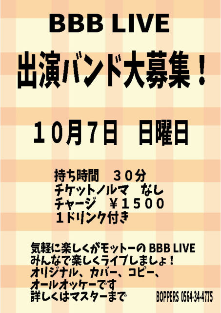BBB LIVE 出演バンド大募集! 2018年 10月7日 日曜日 持ち時間 30分 チケットノルマ なし チャージ ¥1500 1ドリンク付き 気軽に楽しくがモットーのBBB LIVE みんなで楽しくライブしましょ! オリジナル、カバー、コピー オールオッケーです 詳しくはマスターまで