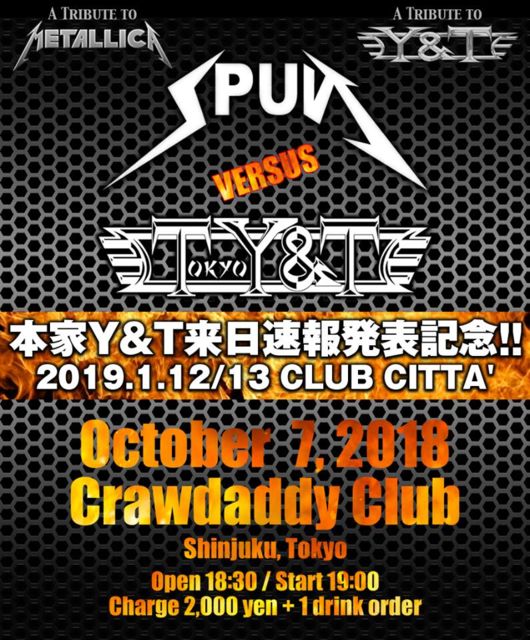 10/7 本日のライブ Tokyo Y&T vs. SPUN LIVE OPEN 18:30 START 19:00 CHARGE 2000円 act ・Tokyo Y&T (Y&T Tribute) ・SPUN (Metallica Tribute)