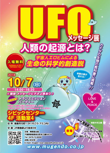 ★第1部「地球人は科学的に創造された」パネル展&上映会 【開場】14:00 【開演】14:00-14:50 どなた様もご自由にご入場できます♪ お気軽にお越し下さいませ(^-^)/ カナダの生物の教科書に掲載されました エロヒムによる科学的創造論をお伝えいたします。 ★第2部トランスミッション&パーティー♪♪♪ 【開演】 14:50-16:20 トランスミッションとは、創造者エロヒムのコンピューターに細胞の設計図 (個々人のDNA配列)を伝送するイベントです。 「宇宙人からの