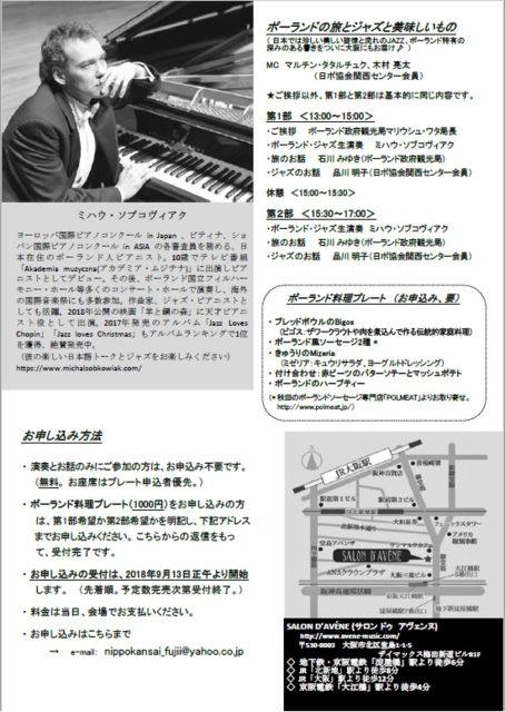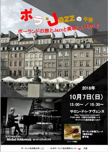10/7に大阪でポーランドジャズと旅行のお話を楽しめるイベントが開催されます。 日本ポーランド協会関西センターがポーランド政府観光局とのコラボで企画している催しで、ポーランド・ジャズをポーランド人ピアニスト ミハウ・ソプコヴィアクさんが演奏し、さらに旅やジャズのお話で連休の午後のひと時をお過ごしください。 秋田県のポーランドソーセージ専門店ポルミートの美味しいソーセージが楽しめる料理プレートも注文できます。場所は大阪市の北区堂島。関西の方もその他の地方の方も、ちょうど連休のイベントなのでぜひご参加ください。