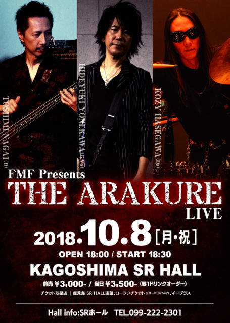 ★鹿児島初上陸!爆音トリオバンド!★ THE ARAKURE LIVE 2018年10月8日(月・祝)@SRホール OPEN 18:00 / START 18:30 前売3000円/当日3500円(要1ドリンクオーダー) チケット取扱店/SRホール店頭、ローソンチケット(Lコード82642)、イープラス、Infinity Hall info:SRホール TEL.099-227-0337 ※O.A. 風来坊TOSHI ●THE ARAKURE プロフィール 永井敏己 (B) 米川英之 (G.Vo) 長谷川浩二 (Dr) ジャンルを問わず数々のアーティストのレコーディングやライブをサポートしているミュージシャンが集まって、2015年に結成されたスリー