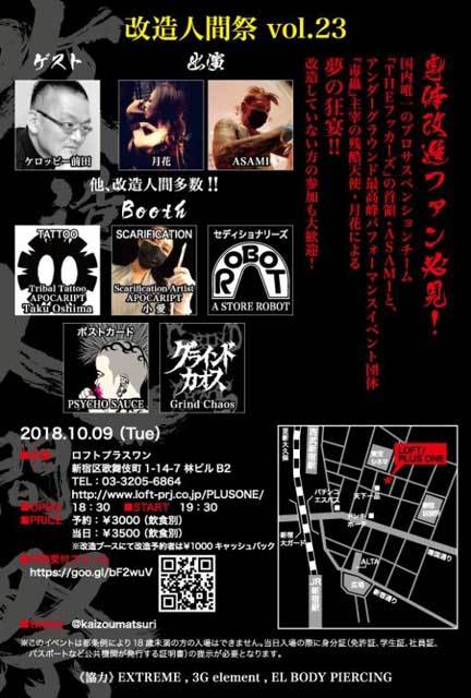 日時:2018年10月09日(火) 会場:歌舞伎町ロフトプラスワン OPEN 18:30 / START 19:30 予約¥3000/当日¥3500(飲食別) ※改造ブースにて改造予約者は¥1000キャッシュバック <予約受付> https://goo.gl/bF2wuV 身体改造ファン必見! 国内唯一のプロサスペンションチーム『THEフッカーズ』の首領・ASAMIと、アンダーグラウンド最高峰パフォーマンスイベント団体『毒蟲』主宰の残酷天使・月花による夢の狂宴!! 改造していない方の参加も大歓迎! 【出演】 月花 ASAMI 他、改造人間多数!! 【ゲスト】 ケロッピー前田